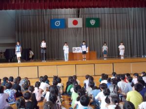 最後は偶数学年の代表児童が、前期に頑張ったことを発表しました。学習のこと、あいさつのこと、友だちのこと、運動会のこと、修学旅行のこと等を堂々と発表できました。