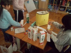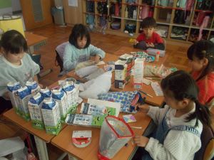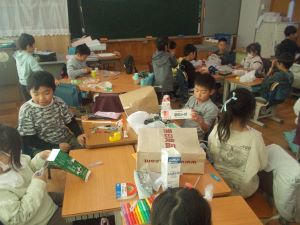 2年生が、1年生と一緒に学習するおもちゃを作りました。こまやけん玉、紙とんぼなど各グループで作り方を確認しながら楽しく活動していました。1年生のために皆一生懸命に頑張っています。1年生の皆さん楽しみにしていてね!!