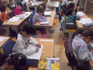 1年生が国語の時間に、自分で物語を考えて書き表しました。ふきだしの内容をもとに、「あおむし」が誰と出会ったり、そこでどんなことを思ったりするのかを、想像をふくらませながら、展開を考えていました。優しい言葉やセリフがたくさん見られ、読んでいて温かい気持ちになりました。後半は完成した物語を読み合いました。