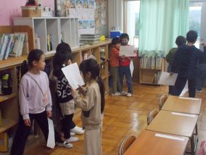 5年生が6回目の即興演劇を実施しました。今回は連続ドラマ編ということで、お題に沿ってその時その時の動きを考えて演じるという内容でした。6回目ということで、子ども達はだいぶ慣れており、堂々と演じていました。