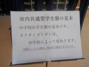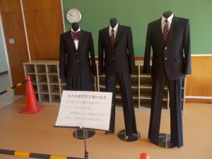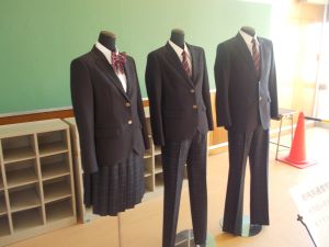 来年度から白井市内中学校が標準制服になることを受けて、南山中学校より、制服の見本が届きました。3階の高学年フロアに飾ってあります。ネクタイやリボンは中学校区によって異なります。