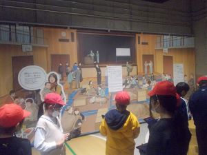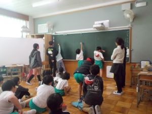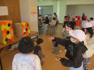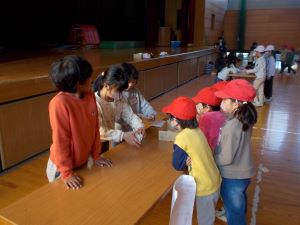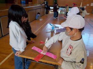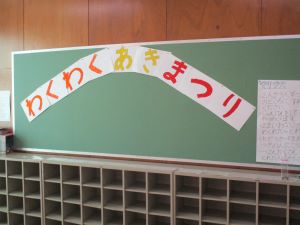 1年生が生活科の学習で、『わくわくあきまつり』を行いました。普段お世話になっている6年生を招待し、1年生がそれぞれの仕事をしました。けん玉、神経衰弱、オナモミダーツ、玉飛ばし、的入れなど工夫を凝らした遊びばかりで、6年生は楽しんでいました。最後は、1年生がペットボトルの蓋で作ったかわいい小物を6年生にプレゼントしました。思い出に残る一日となりました。