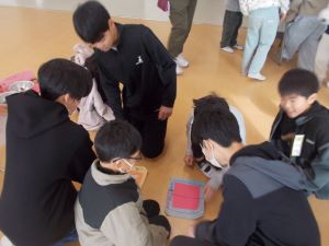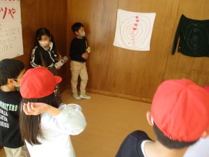 生活科の学習で、1年生が6年生を招待して、ゲーム大会を実施しました。秋に収穫したまつぼっくりやどんぐり、落ち葉等を使って様々なおもちゃを作り、6年生を招待して楽しんでもらうという内容です。けん玉、ダーツ、かるた等のルールを1年生がわかりやすく説明していました。
