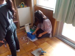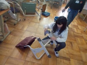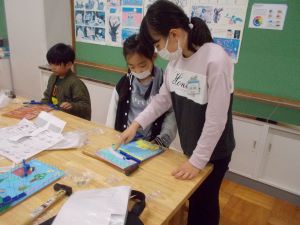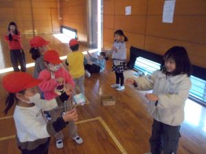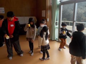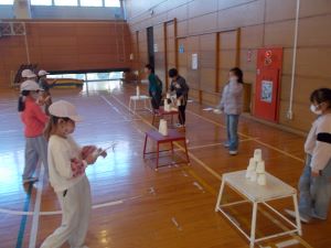 2年生が昨日まで頑張って作っていたおもちゃを使って、1年生を招待して「おもちゃ大会」を実施しました。紙とんぼ、ぶんぶんごま、割りばしロケット、けん玉、こま、ぴょんぴょんがえるのそれぞれグループごとに、2年生が説明をし、1年生が楽しんでいました。遊んでいる途中で壊れてしまうハプニングもありましたが、2年生がその場ですぐに直し、頼もしい姿も見られました。