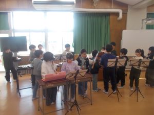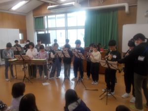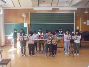 3年生が音楽の時間に、「パフ」という曲の合奏練習をしました。今日は中間発表ということで、2つのグループに分かれて、それぞれ聴き合う学習です。リコーダー、鍵盤ハーモニカ、鉄琴、タンバリン、カスタネット、エレクトーン、ピアノなどで一人一人が頑張って演奏をしていました。
