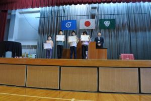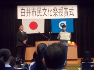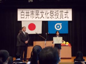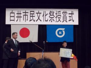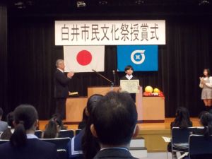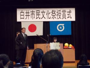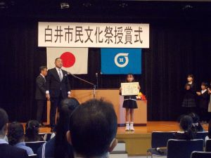 11月29日(土曜日)に白井文化会館かおりホールで、市民文化祭の授賞式が行われました。本校からは、図画、書写、工作の部で6名の児童が受賞しました。市長、議会議長、教育長からそれぞれ表彰され、皆堂々とした態度で賞状を受け取りました。受賞した児童の皆さん、おめでとうごさいます。