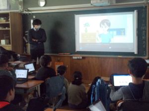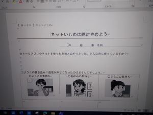 5年生がICT支援員さんの協力のもと、道徳の時間にネットに関するトラブルについての学習を行いました。友だち同士のスマートフォンを介してのやりとりで、トラブルになったことを動画を使って確認しました。その後ネット上でのいじめに発展する原因について、それぞれが考えました。子ども達にとって身近になってきたスマートフォンの内容でしたので、本日の学習内容をしっかりと忘れずにいてほしいです。