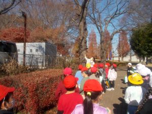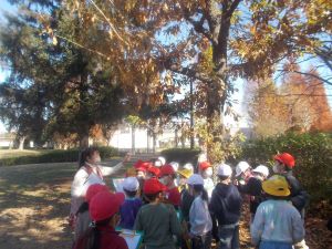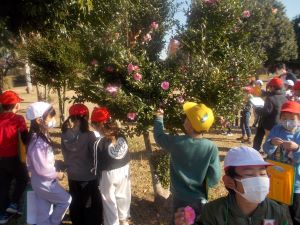 1年生が学校隣の公園で植物の観察をしました。葉の色、木の実、音など前回と比べて変わっているところを調べました。クヌギの木の様子やプラタナスの木の肌、サザンカの花の色などよく観察していました。