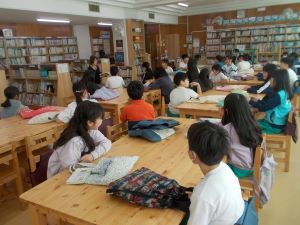 4の1は校庭で5分間走、4の2は図書室で読書を行っていました。校庭では、自分のペースを考えて走り、大きな声で友だちを応援する姿が見られました。図書室では、読書活動推進補助教員が読み聞かせを行い、集中して聞く姿が見られました。