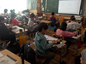 3年生のクラスでは、書写で毛筆を行い、「曲がり」と「おれ」に気をつけて『ビル』を書いていました。もう一クラスでは、算数科で「小数の引き算」を行い、0や小数点の扱いに気をつけながら、問題を解いていました。2クラスとも集中して課題に向かっている姿が見られました。