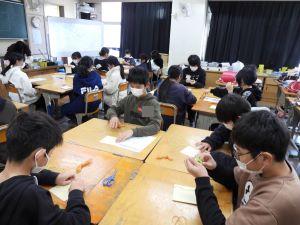 4年生が最後の自然観察会を行いました。今回は、公園ではなく、学校近くの調整池やその周りで観察・体験をしました。笹の葉での笹船作り、植物クイズ、ムクロジの皮を使っての石けん作り、池にいる野鳥観察・・・とても充実した時間でした。この一年間で多くの事を学べた自然観察会でした。お世話になった自然観察員の皆様、子ども達のためにご指導いただきありがとうございました。