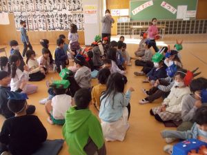 1・2年生が節分についての学習に取り組みました。 節分にまつわる読み聞かせを通して、季節の行事への理解を深めたあと、2年生が手作りした鬼のお面を使って活動を楽しみました。
