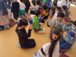 子どもたちは、お面に向かって豆をまくまねをしたり、1年生にお面をかぶせてあげたりと、学年をこえて関わり合う姿が見られました。 笑顔あふれる、微笑ましい時間となりました。