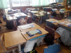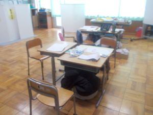 本日ワンポイント避難訓練を実施しました。予告なしで行いましたが、どの学級もすぐに机の下にもぐり、黙って待つことができました。