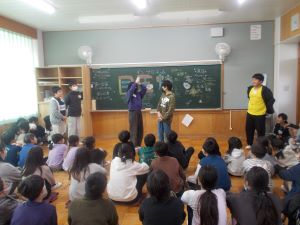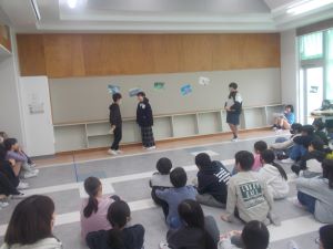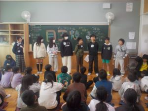 一年間かけて学習してきた即興演劇も本日が最終日となり、集大成としての発表会を実施しました。6年生が4・5年生の前で「かさじぞう」「3匹のこぶた」「元になるお話がないところから物語を作る」「お客さんからお題をもらいその場で作る」のグループに分かれ発表を行いました。今までの練習の成果を生かし、役に成り切り演技をしたり、その場でストーリーを考えて表現したりしながら4・5年生を楽しませていました。