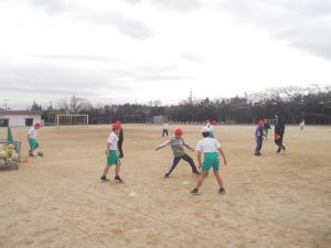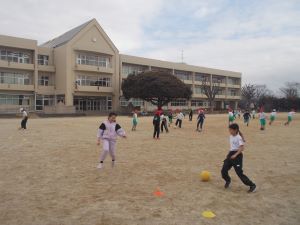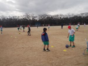 4年生が寒空の下、校庭で元気にラインサッカーの練習をしていました。定位置でのパス練習、その後移動しながらのパス練習と蹴る方向と強さを意識しながら取り組んでいました。