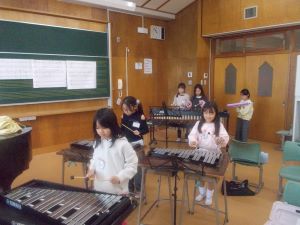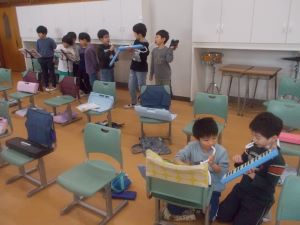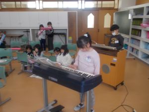 2年生が音楽の時間に、歌や楽器の練習を行っていました。『こぐまの二月』という曲を鍵盤ハーモニカ、鉄琴、木琴、オルガン、キーボードなどに分かれて、友だちと合わせてリズムよく演奏し頑張っていました。