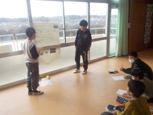 1年生がすごろくを作っていました。一年間の行事や学習を思い出して、スタートからゴールまでを書き表しました。「運動会でつかれたので1回休み」「学校探検していろんな場所を知った。4マス進む」「ねぼうして学校に遅れた。ふり出しにもどる」など楽しく作っていました。