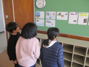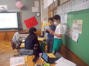 1年生が先生方にインタビューをする学習の準備をしていました。グループ毎に聞いてみたい先生と質問したい内容を決めていました。自分の考えをしっかりと友だちに伝える姿が見られました。