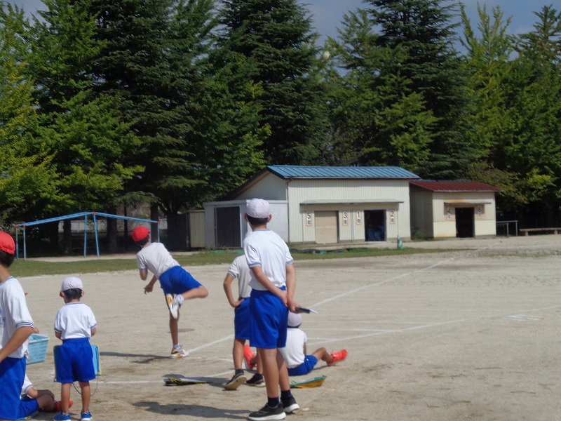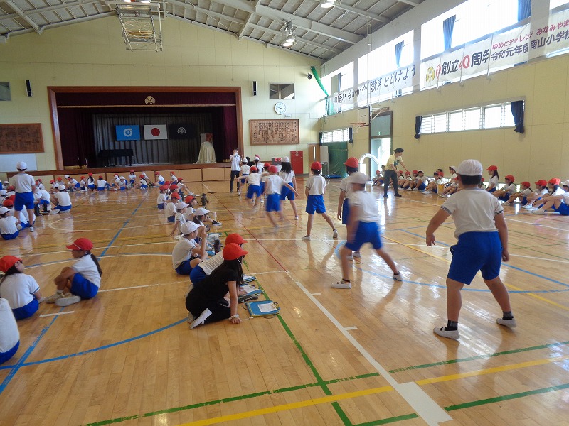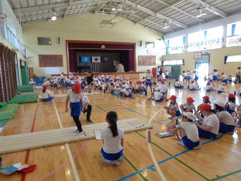 2,3校時に全校一斉で新体力テストがありました。初めてテストを行う1年生は、6年生に付き添ってもらい、50m走、反復横跳び、上体起こし、ソフトボール投げ、立ち幅跳びに挑戦しました。(握力、長座体前屈、20mシャトルランは後日行います。)今日も暑かったですが、日陰で休んだり、水分補給を適宜行ったりして、無理なく実施しました。体育館玄関にきれいに靴が並べられているのを見たとき、毎日を気持ちよく過ごしたいという思いが表れていて、とてもうれしく思いました。