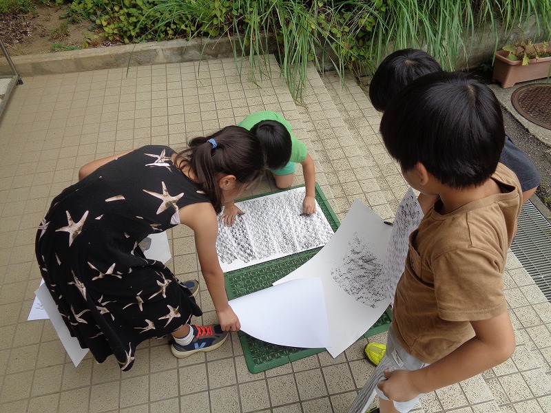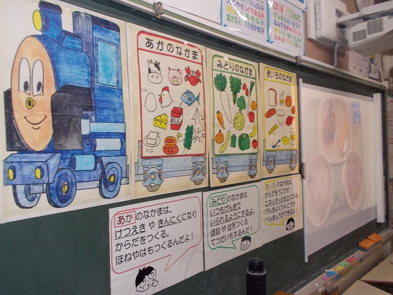 4年生では、ALTの先生と一緒に外国語活動が行われていました。元気な掛け合いがされていて、この学習が好きなのが伝わってきました。1年生は外に出て、大きな画用紙に一生懸命描いていました。近づいて見てみると、でこぼこしたところを探して、黒いクレヨンでこすりだしをしていました。画用紙いっぱいにこすりだしをして、この後どんな絵になっていくのか楽しみです。2年生の教室では、給食センターの栄養士さんによる栄養指導が行われました。給食は大きく3つの栄養に分けることができ、それぞれをバランスよく食べられるよう、よく考えられて献立が作られていることを改めて知りました。よく噛んで、苦手な物もチャレンジして、完食を目指していきたいですね。今後他の学級にも指導に来てくださいます。