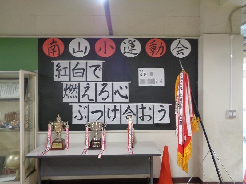 今年の運動会のスローガンは、「紅白で 燃える心 ぶつけ合おう」です。1階の渡り廊下に掲示されました。また、本日より朝の応援練習、全体練習が始まりました。応援団に負けじと、精一杯声を出して練習している南山っ子、素晴らしかったです。全体練習では、応援団長の紹介があり、運動会と応援への意気込みを話してもらいました。それを聞いた児童たちはますますやる気に満ちあふれていました。