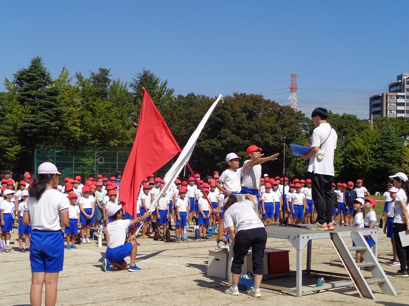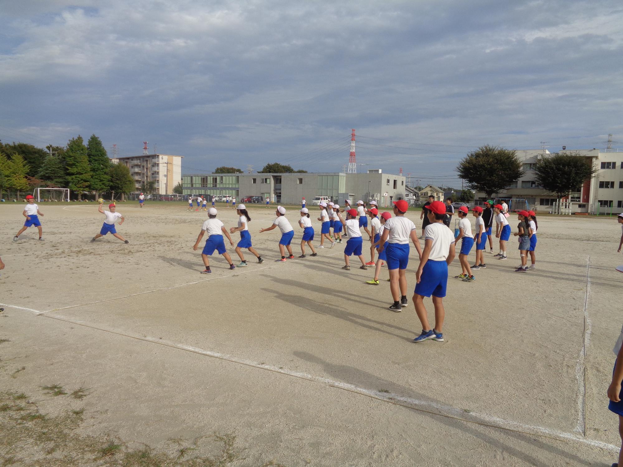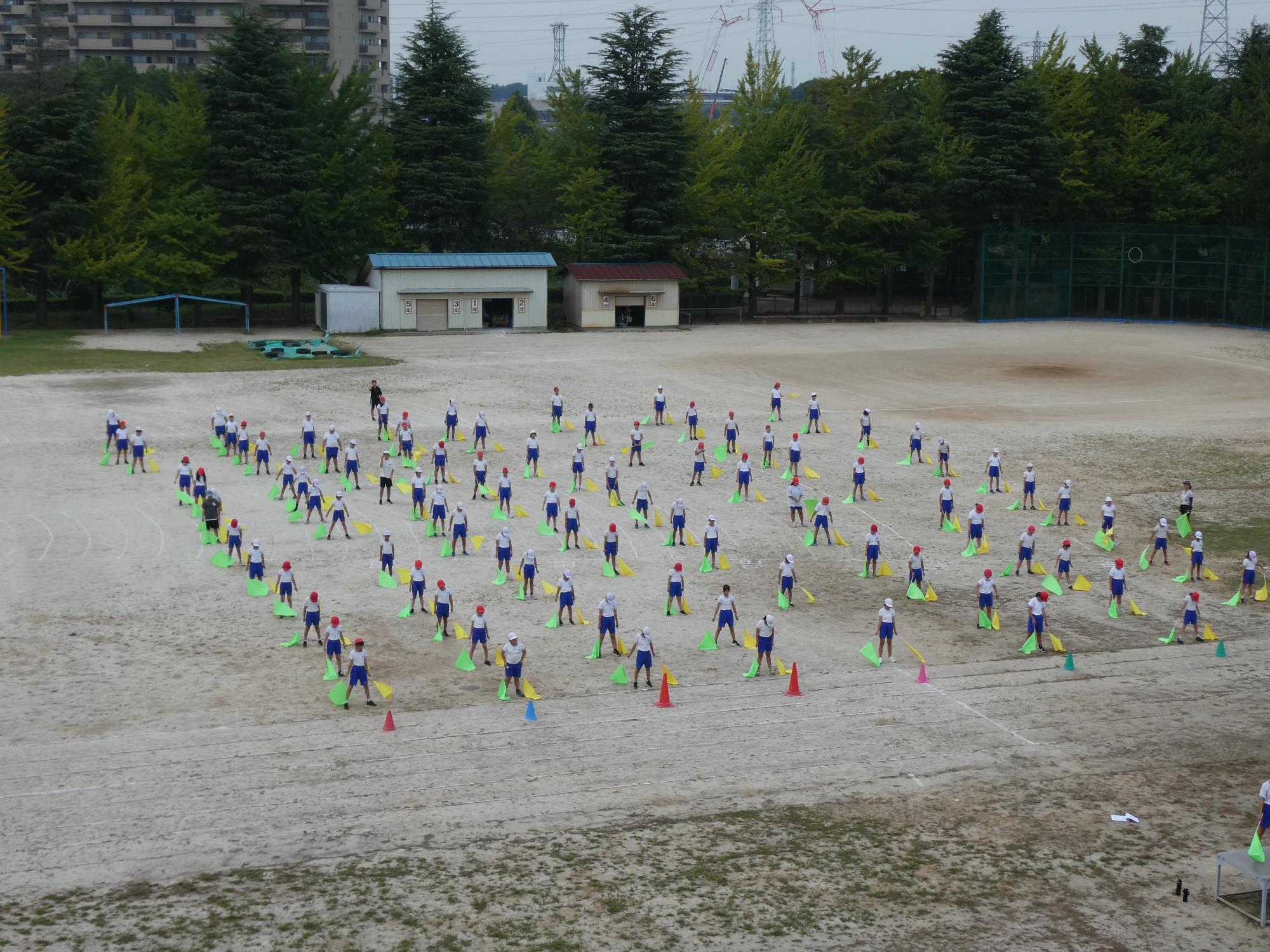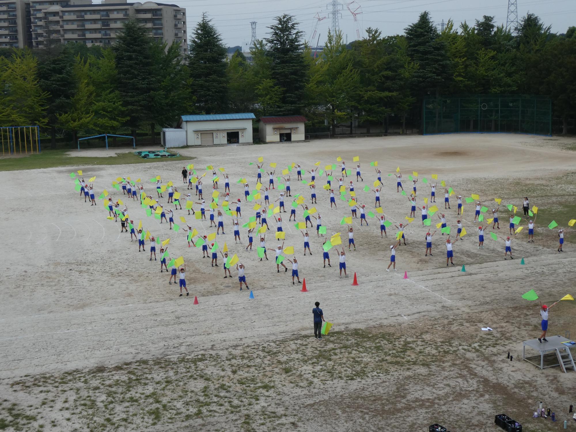 5・6年生の運動会練習、フラッグによる表現が校庭で行われました。