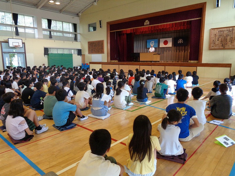 前期終業式が体育館で行われました。式が始まるまで少し待つ時間がありましたが、背筋をのばし、そして声を発する児童は一人もいなく、よい緊張感が漂っていました。校長先生のお話では、三つのお話がありました。一つ目は、この半年間頑張ったことを自分で認めることです。二つ目は、「ありがとう」を伝えることです。先生や友達、そして毎日温かく送り出してくれた家族へ感謝の気持ちを伝えることの大切さを教えてくれました。最後に、「かしこくなるために」のお話でした。姿勢をよくして人の話を聞くと、かしこくなれると知り、もっと背筋を伸ばして聞く児童の姿が印象的でした。前期頑張ったこと紹介の発表もありました。「算数」「南山コンサート」「自主学習」「学級委員」「委員会」等たくさんの頑張りを聞き、友達の頑張りを讃えていました。と同時に自分の頑張りも今日振り返ることができたら素敵だと思いました。保護者の方、地域の方、ご支援ご協力をいただきありがとうございました。明日から後期が始まります。また、児童がそれぞれの目標に向かって一生懸命進むことができるよう職員一同精一杯サポートしていきますので、どうぞよろしくお願いいたします。