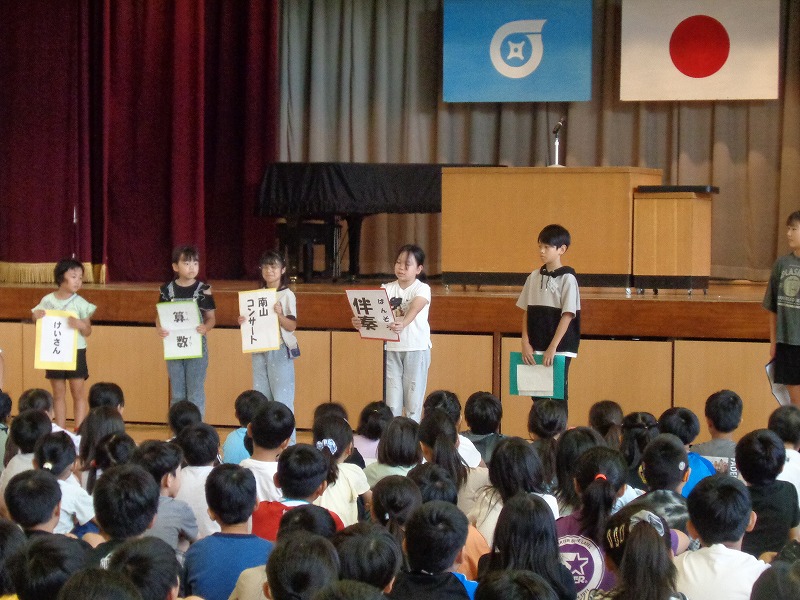 楽しかった夏休みを終え、また元気な声が学校に戻ってきて、先生たちはとってもうれしいです。全校朝会に校長先生が、夏休み中大きな事故やけがなどがなく、みんなが元気に過ごせたことが一番うれしいとお話しされました。また、今日9月1日は防災の日で、日頃から地震だけでなく、大雨や台風、暑さなどの災害に備える大切さのお話もありました。みんなで力を合わせて、安全に楽しく過ごしていきたいですね。全校朝会のあとの教室をのぞくと、先生のお話を一生懸命に聴いている姿、久しぶりの友達との再会を喜ぶ姿、新しい教科書にうれしそうにていねいに名前を書く姿などがあり、そのやる気が頼もしく思えました。まだまだ暑い日が続きます。暑さ対策をしっかりして、毎日登校してください。みんなでまた素敵な南山小学校にしていきましょう!