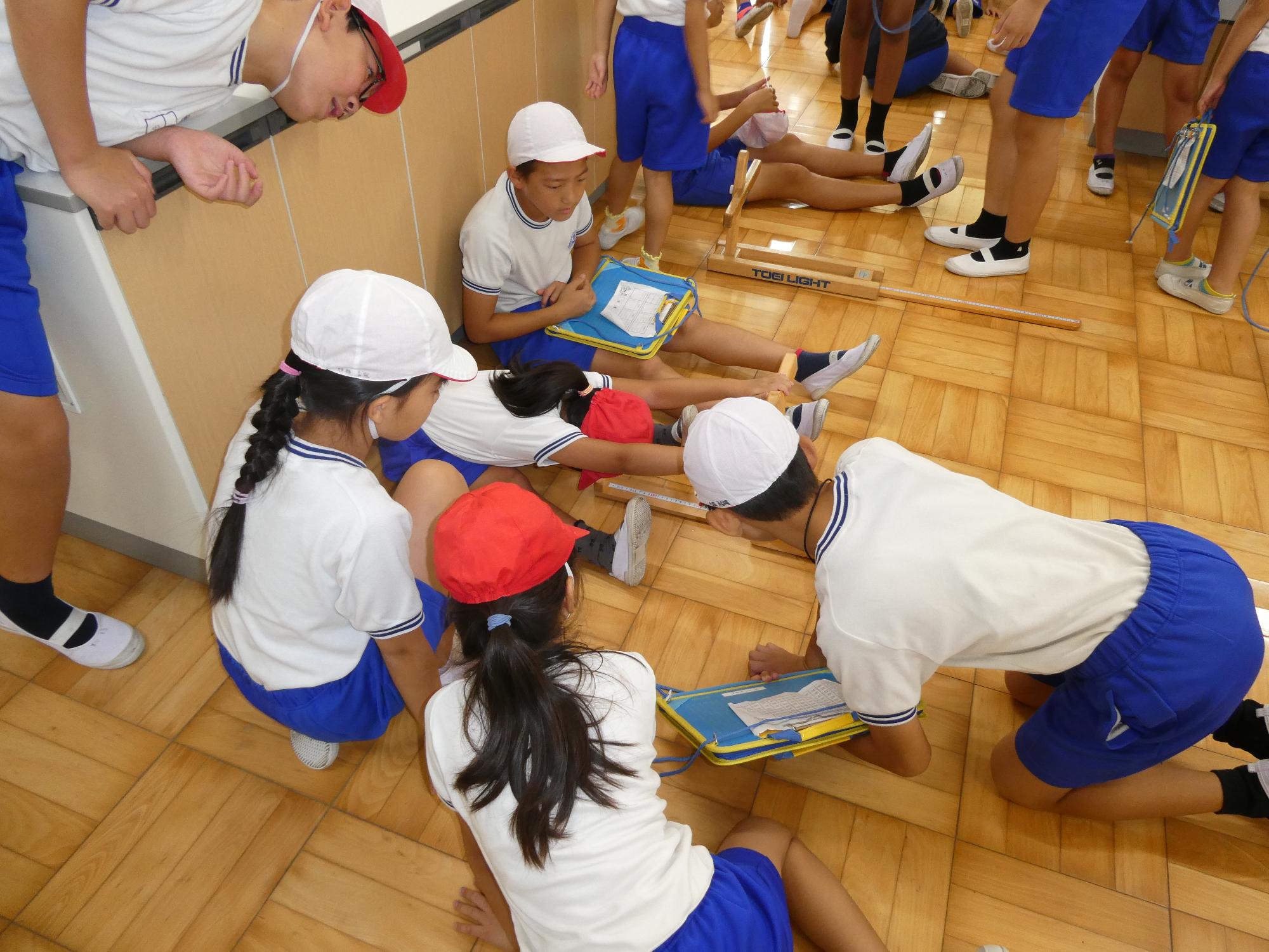 1年生が新体力テストの種目、シャトルランと長座体前屈を行いました。1年生にとっては初めての経験なので、6年生が声をかけながら一緒に走ったり、そばでやり方を教えたりしてくれました。1年生の最後まで一生懸命走っている姿に元気をもらいました。今後の成長が楽しみです。