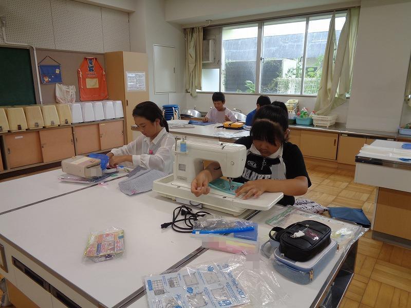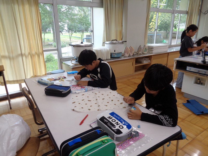 5年生が家庭科室で、ランチョンマットを作成していました。自分でデザインを考え、ランチョンマットに刺繍をしていました。針に刺繍糸を通すのは一苦労しますが、粘り強く取り組んでいました。自分で作ったランチョンマットを机に敷いて給食を食べることができるといいですね。