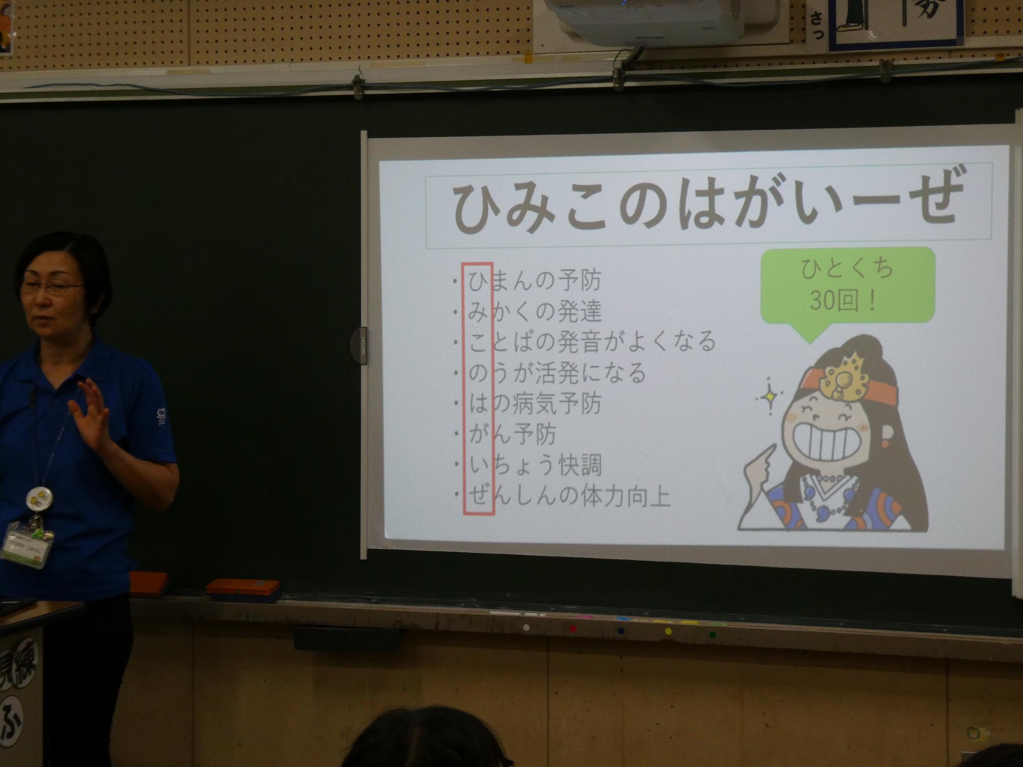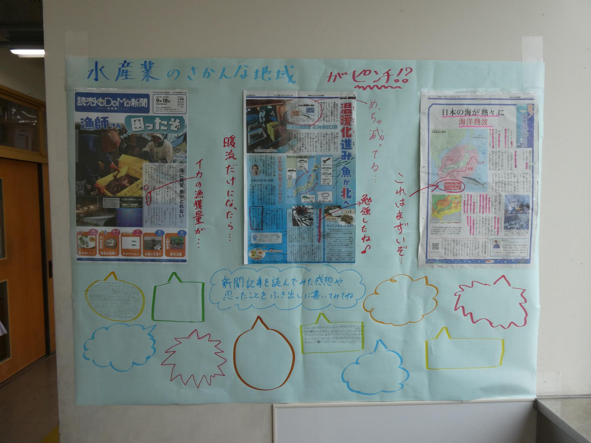 よく噛んで食べることの合い言葉、「ひみこのはがいーぜ」を教えていただき、今日はよく噛んで食べました。今日のメニューには魚がありましたが、苦手な子は、社会科で学習した水産業についてを思いだし、少しでも多く食べていました。廊下には、子供新聞に掲載されていた水産業の危機に関する記事が貼ってあり、自分たちの暮らしと食に関して学びを深めています。