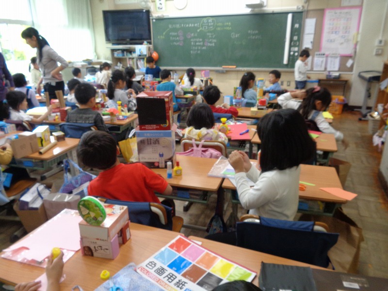 1年生の図画工作科では、箱と箱を組み合わせて、思い思いの物を作っています。接着剤やテープを使って、どうやってくっつけるのかを考えながら作成しています。