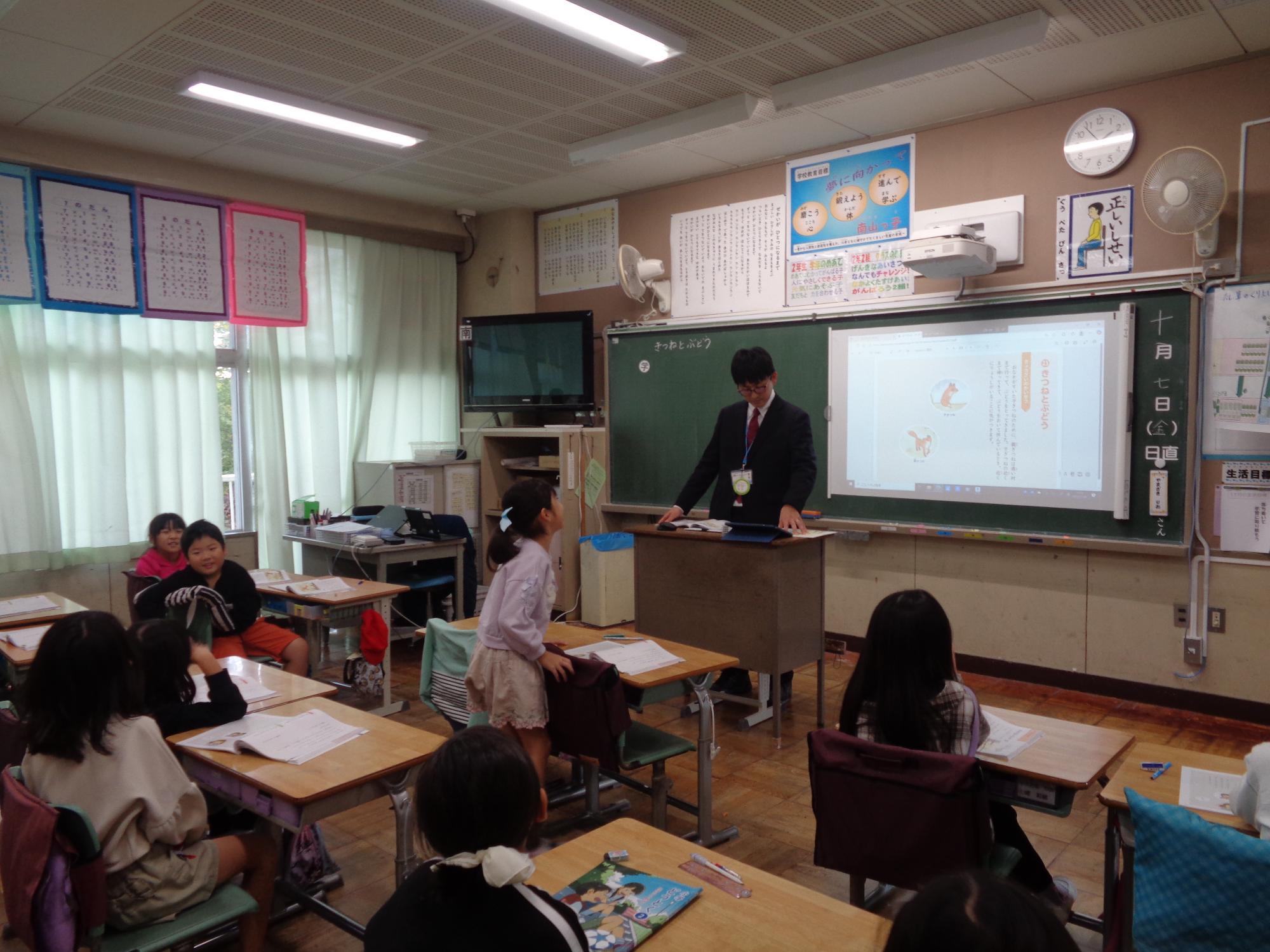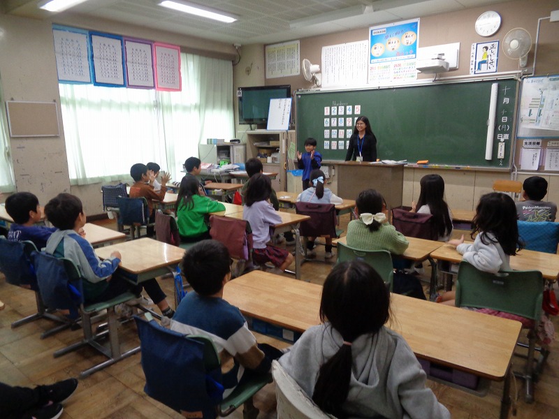 2年生の外国語活動では、数の学習を進めています。選ばれた人が手を叩き、その回数を周りのみんなが英語で答えていました。ALTの先生とも楽しく学習しています。