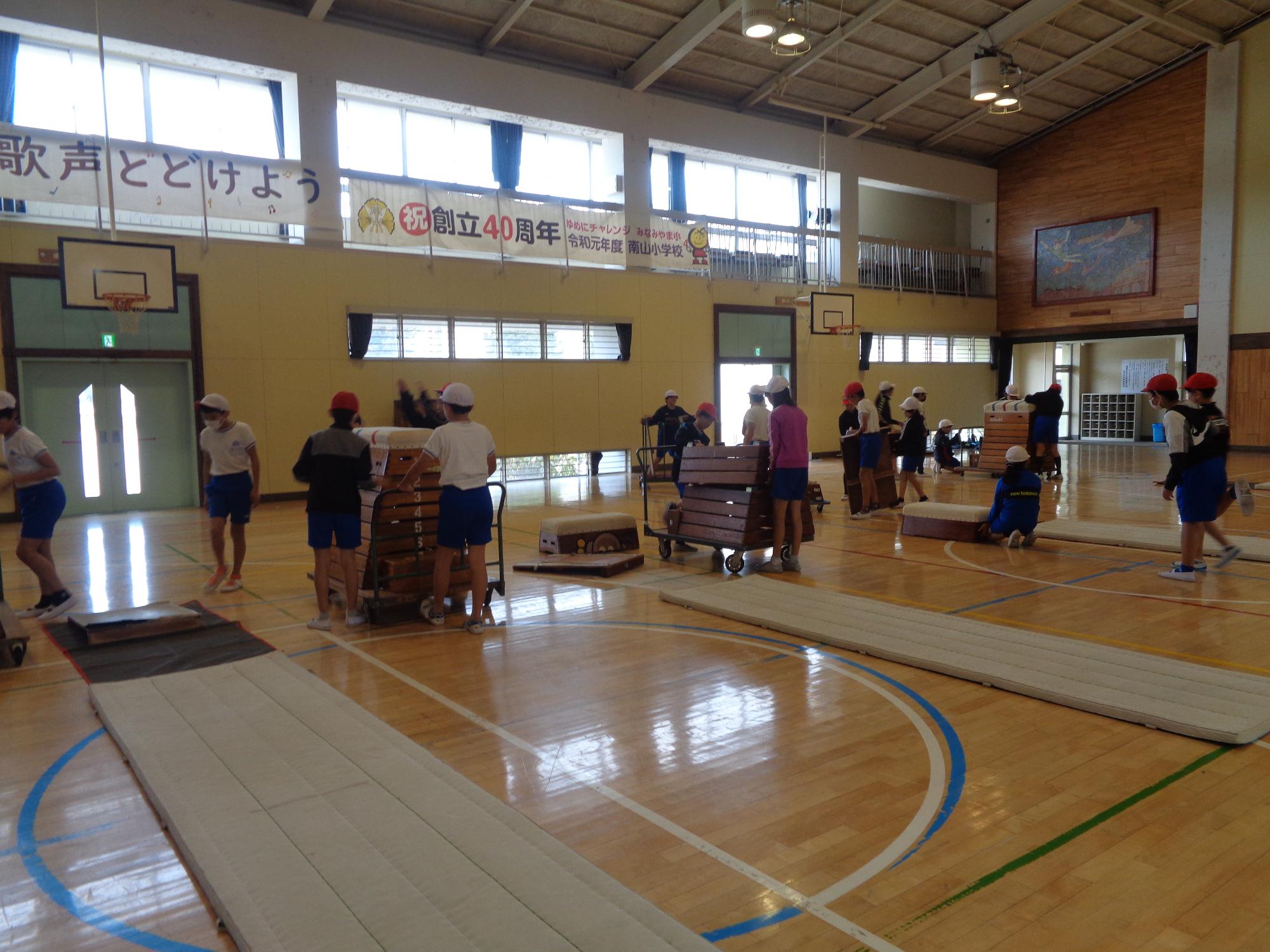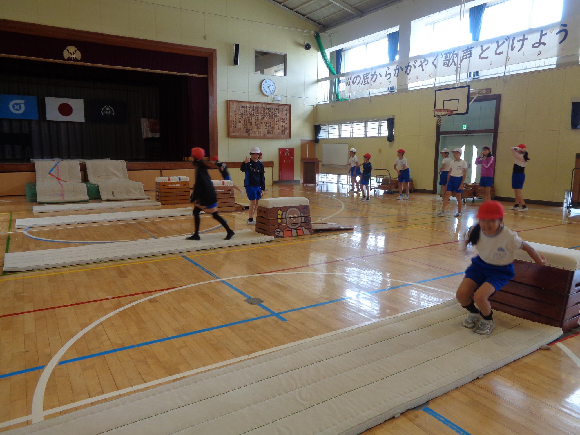 5年生の体育科、跳び箱の学習では、抱え込み跳び、首はね跳びに挑戦しています。どんなところに気を付けたら技がきれいにできるのか考えたり、教え合ったりしていました。今後は、タブレットを使って自分の動きを確認しながら技が完成するように学習していきます。