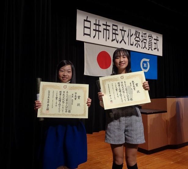 11月29日(土曜日)に白井文化会館で市民文化祭授賞式がありました。本校からは5名の児童が、図画の部、立体作品の部、書写の部、家庭作品の部で授賞し、2名の児童がこの式に出席しました。市長さんからは「どの作品も作った人の思いがとても伝わってくるものばかりで、立派でした。」というお話がありました。授賞した児童のみなさん、おめでとうございます!