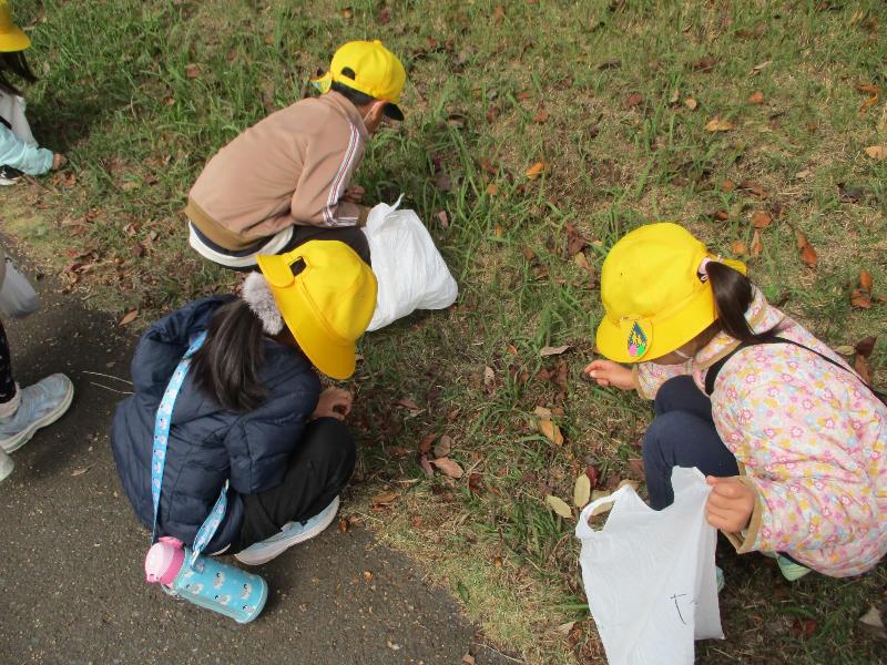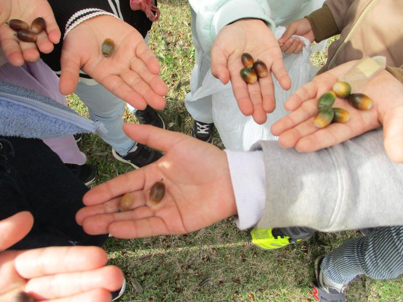 きれいなドングリや松ぼっくりを見つけてうれしそうでした。