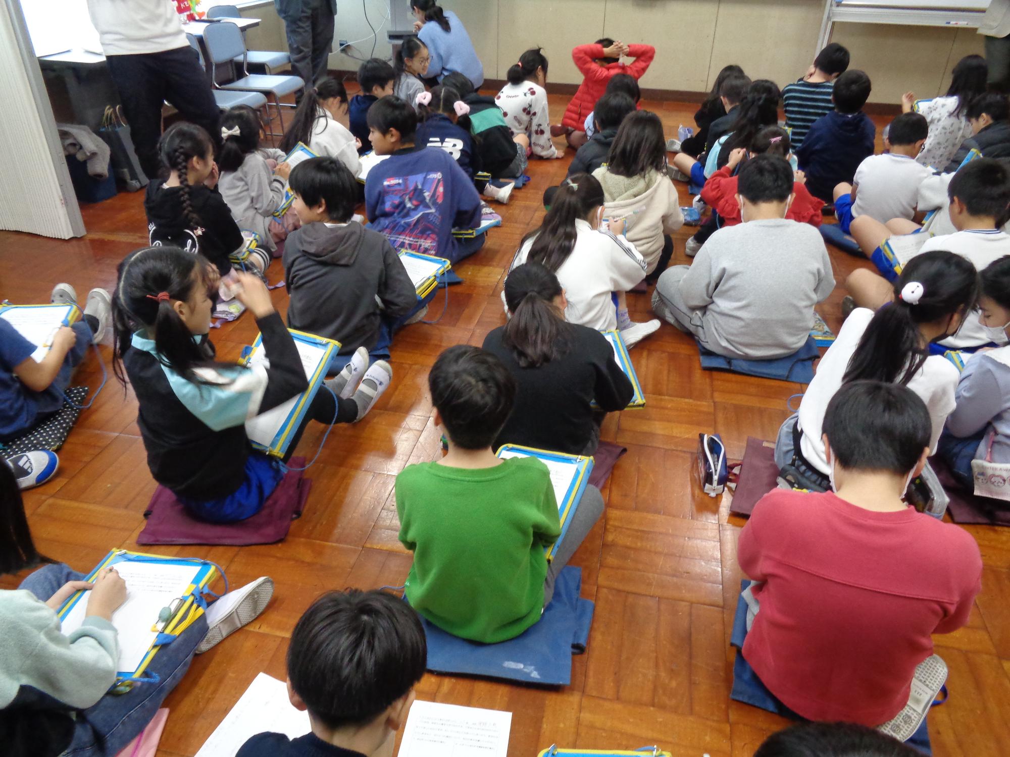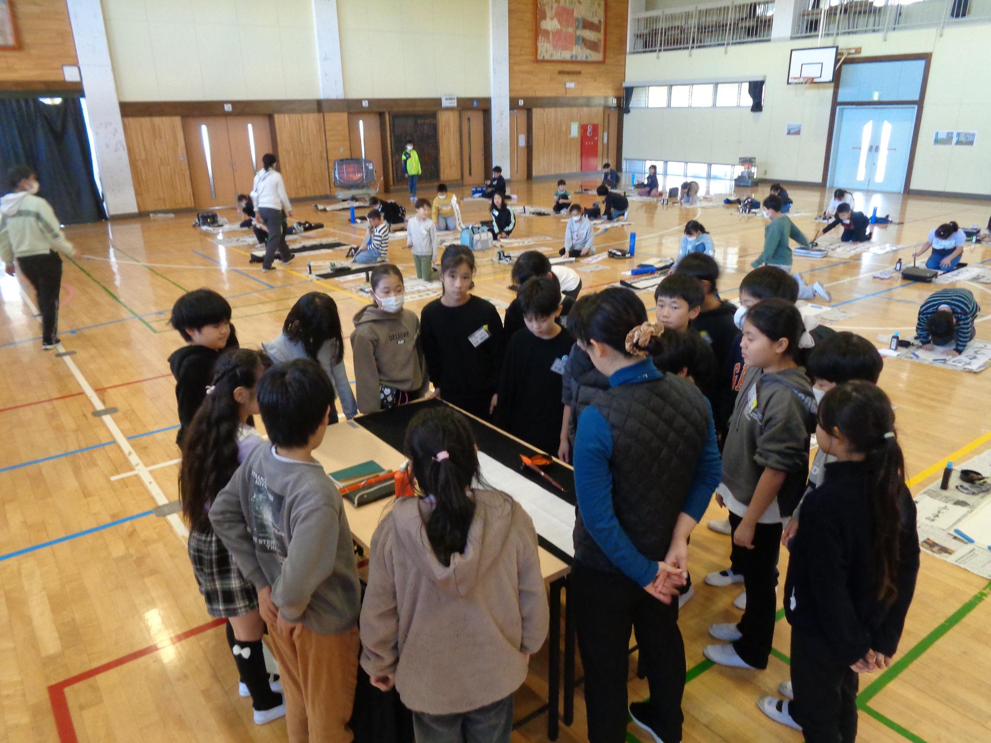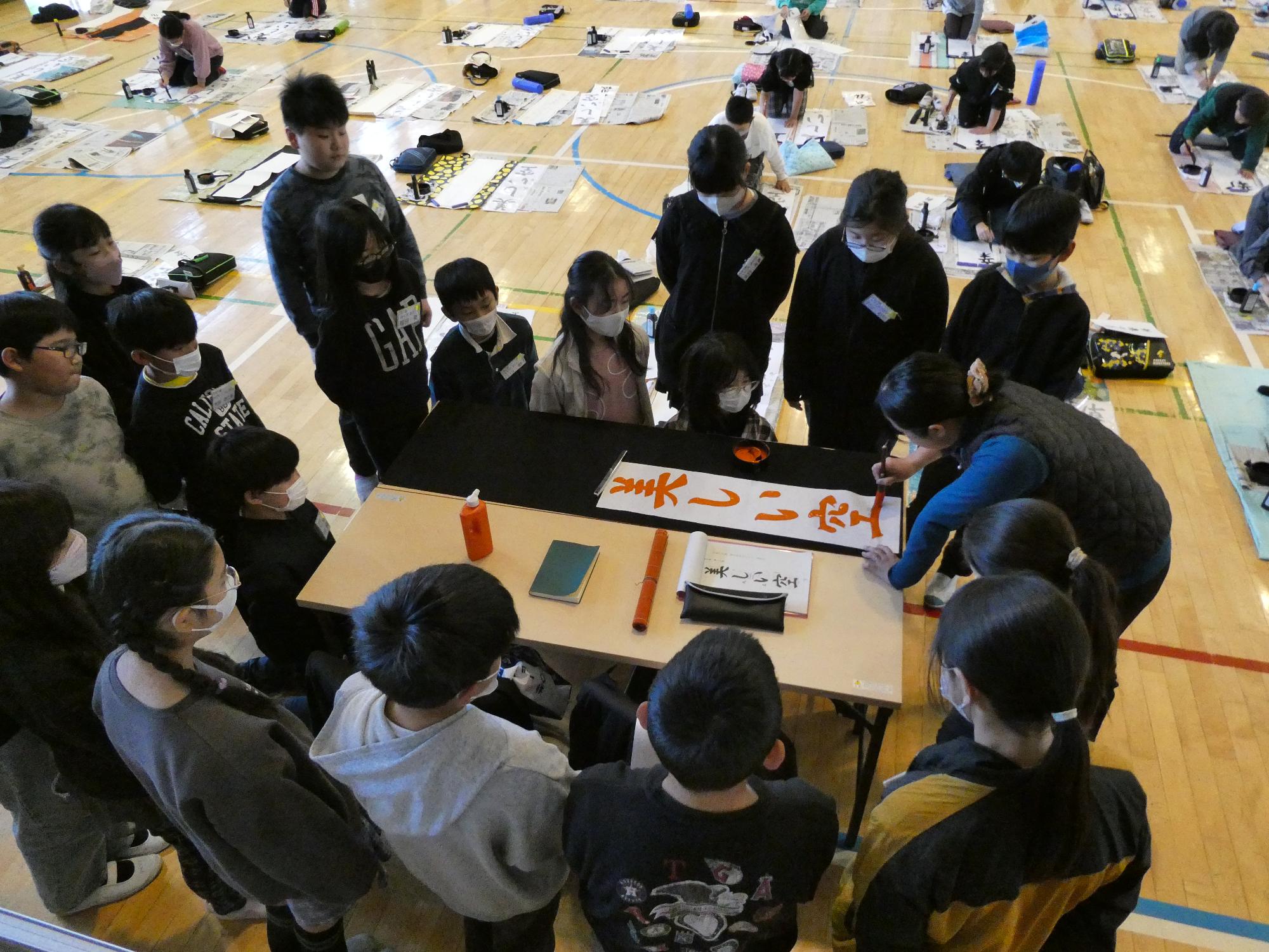 体育館には静かな中にもほどよい緊張感があり、一画一画心をこめて丁寧に書いていました。思うように書けずに繰り返し書く様子や、子ども達が自分から先生に教えてもらおうと手を上げている姿がみられ、最後まで全力で取り組んでいる姿が印象的でした。