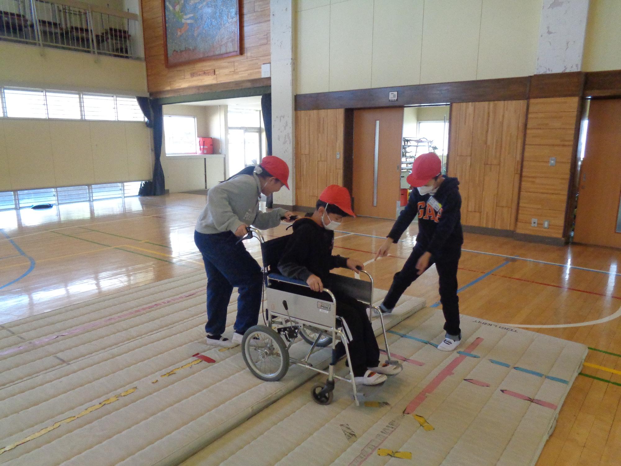 総合的な学習の時間では、福祉体験を行いました。普段の生活のなかでは気づきにくい、車いすに乗ったときの怖さや、車いすを動かすうえで生まれるさまざまな「壁」を体験を通して感じることができました。たとえ小さな段差でも、大きな壁となり、日常生活がとても大変になることに気づき、子どもたちは考えを深めていました。
