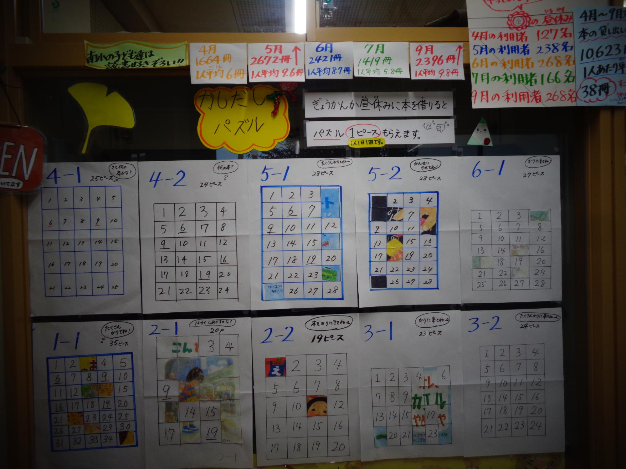 「貸し出しパズル」業間や昼休みに本を借りに来ると1ピースもらえます。完成するとお勧めの本の表紙がでてきます。