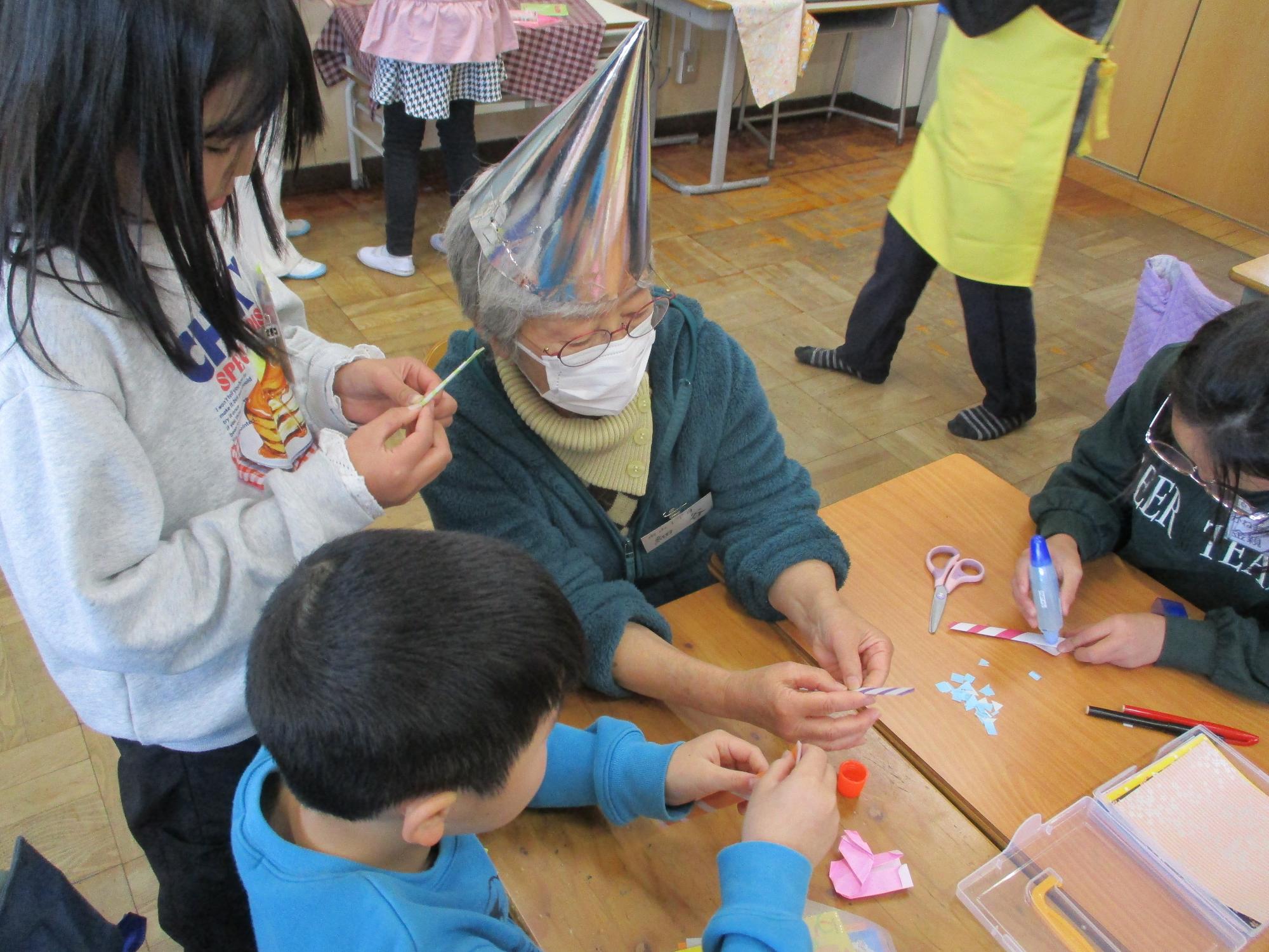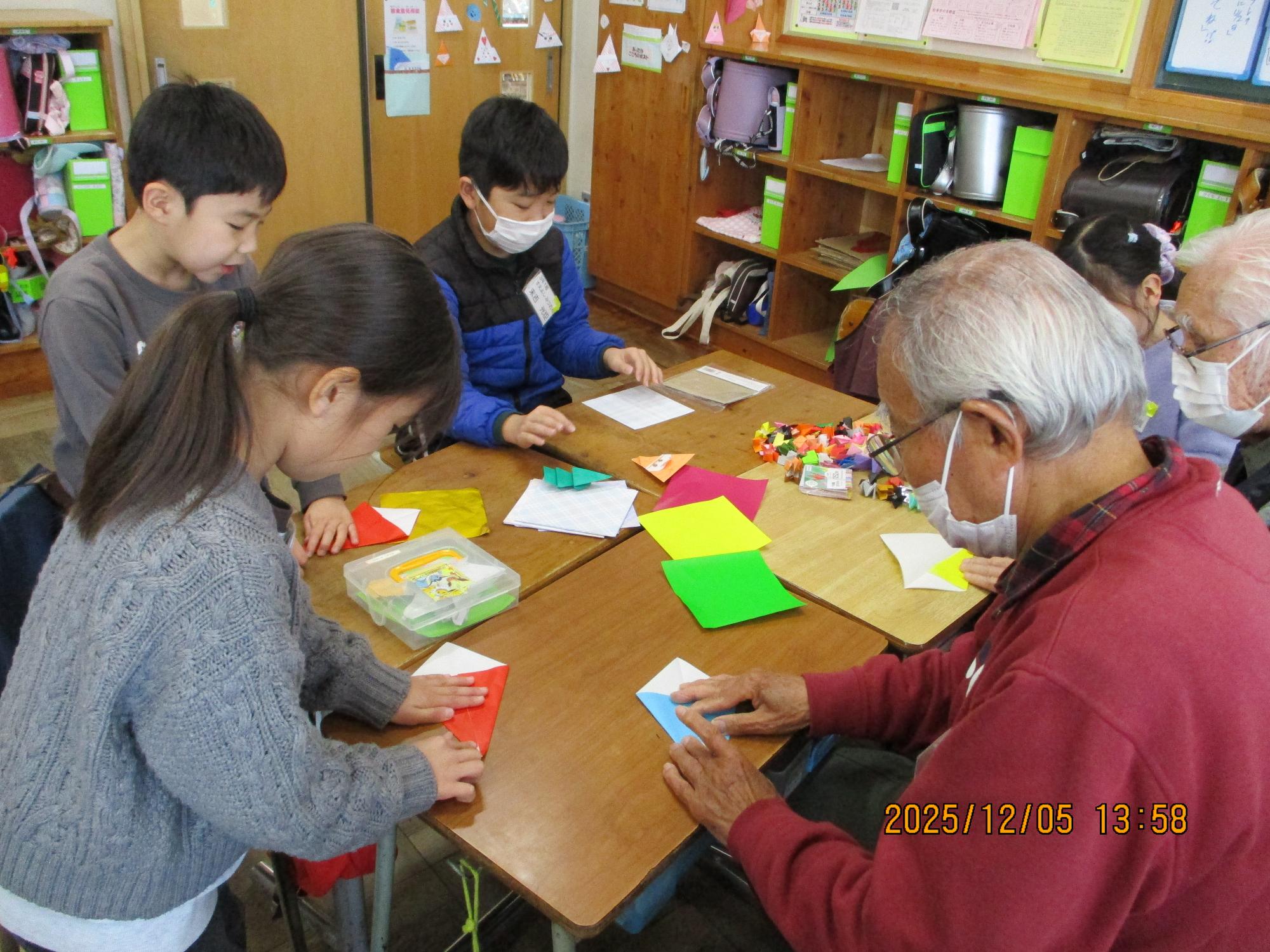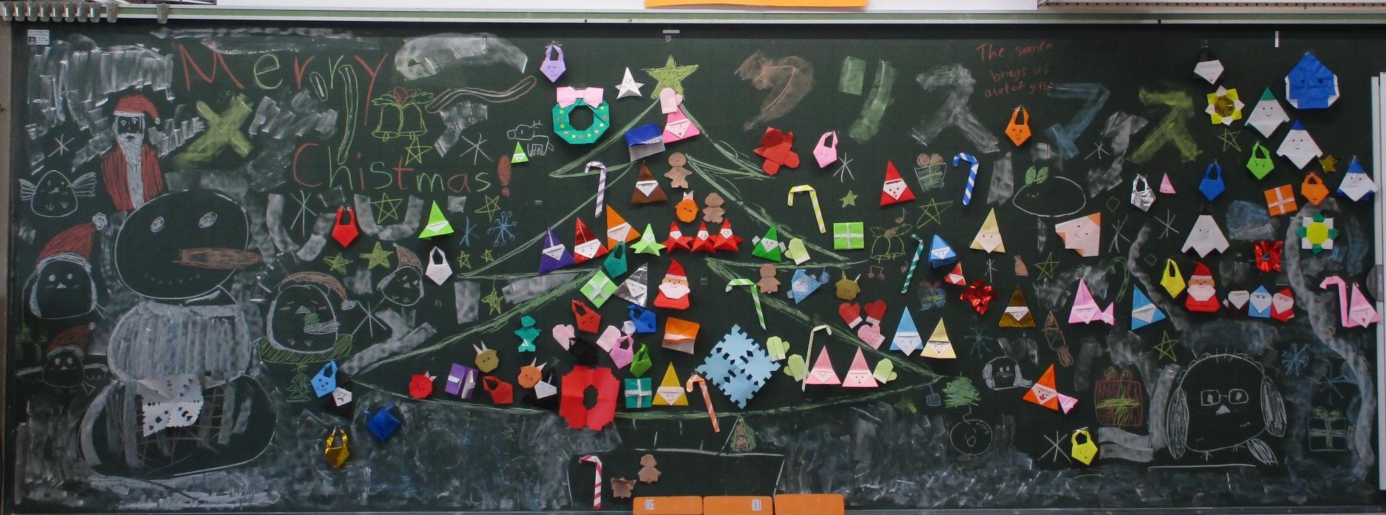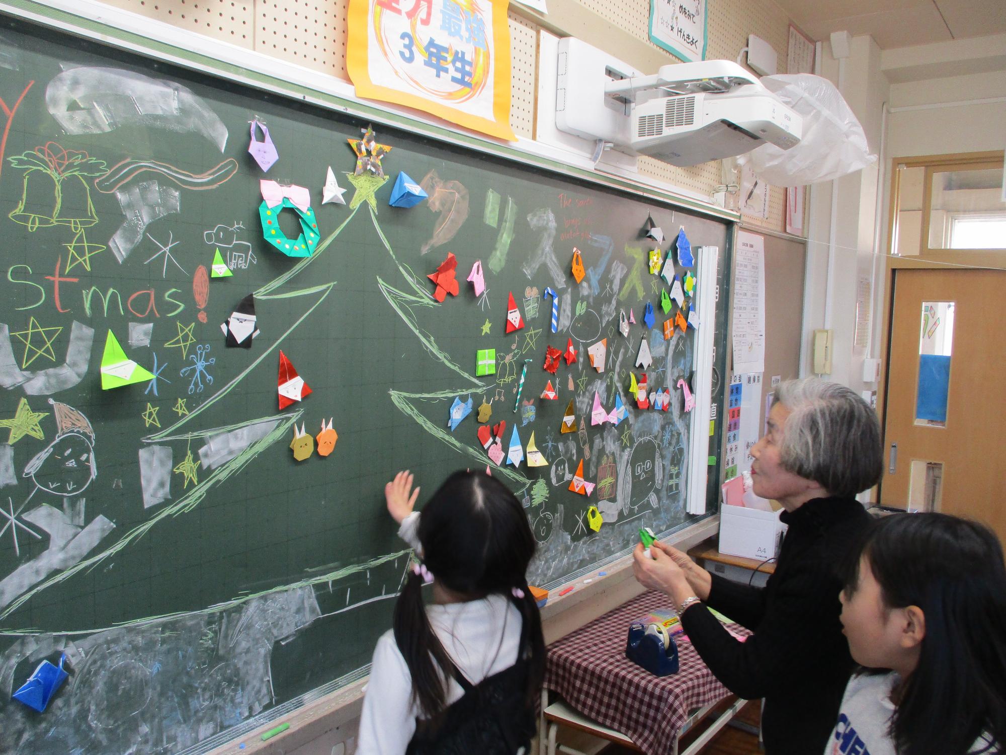 5日(金曜日)七夕交流会に続く2回目の交流の機会でした。七夕での温かな交流を経験した子供たちは、この日を心待ちにしていました。今回は子供たちが交流会を計画しみなさんを迎える会です。クリスマスツリーのオーナメントとなるクリスマス飾りの折り方を一生懸命調べ、練習し、ゲストのみなさんに教えてあげながらたくさんの会話を楽しみました。作ったオーナメントは、1組・2組、それぞれが用意したツリーに装飾していきます。1組は子供の背の高さほどもある手作りクリスマスツリーに、2組は黒板に美しく描かれたクリスマスツリーに飾り、世界に一つだけのツリーを完成させました。子供たちの元気、そして思いやりがみなさんの心を温めるものとなってくれたら嬉しいです。「いつでも遊びに来てください」と、最後にいただいた言葉は、「これからもつながっていられる」という安心感を、子供たちに与えてくれたように感じます。とても素敵な時間でした。