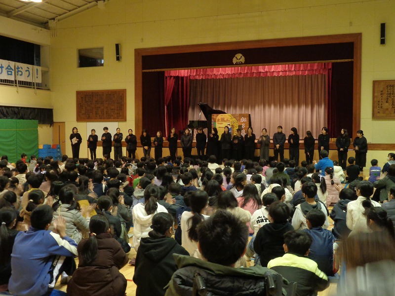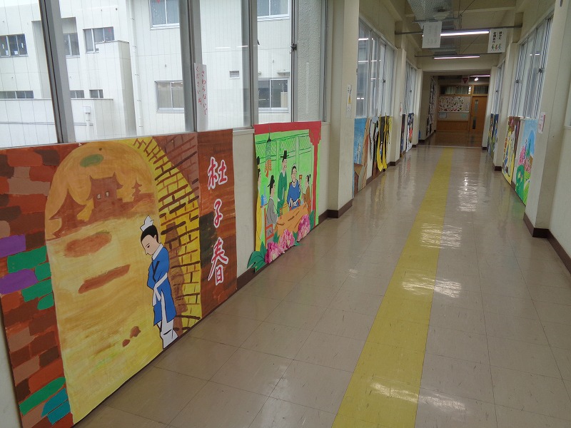 今日はおはなしぶらんこさんによる、朝の読み聞かせと、4校時には大型絵本の読み聞かせがありました。大型絵本の読み聞かせは、体育館で行われました。映画館のような暗い空間で、どんなお話が始まるのかとわくわくした気持ちで子どもたちは待っていました。「杜子春」という中国が舞台の物語で、主人公の杜子春が、仙人との出会いを通じて、自分にとって本当に大切なものを見つけていくというお話でした。引き込まれる朗読、迫力のある音響、場面の様子に合わせた照明、そしてなんといっても何ヶ月もかけて作り上げられた素晴らしい場面絵、とてもとても素敵なお話会になりました。お話の後、場面絵が2階の中央廊下に掲示され、廊下を通るたびにお話を思い出すことができます。ボランティアの皆様、子どもたちの読書活動を支えてくださり本当にありがとうございます。きっと子どもたちの思い出に深く残ったことと思います。そして、今後子どもたちがいろいろな本に手を伸ばしてくれたら嬉しいと感じました。