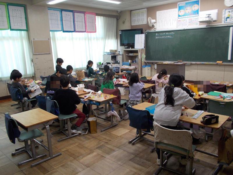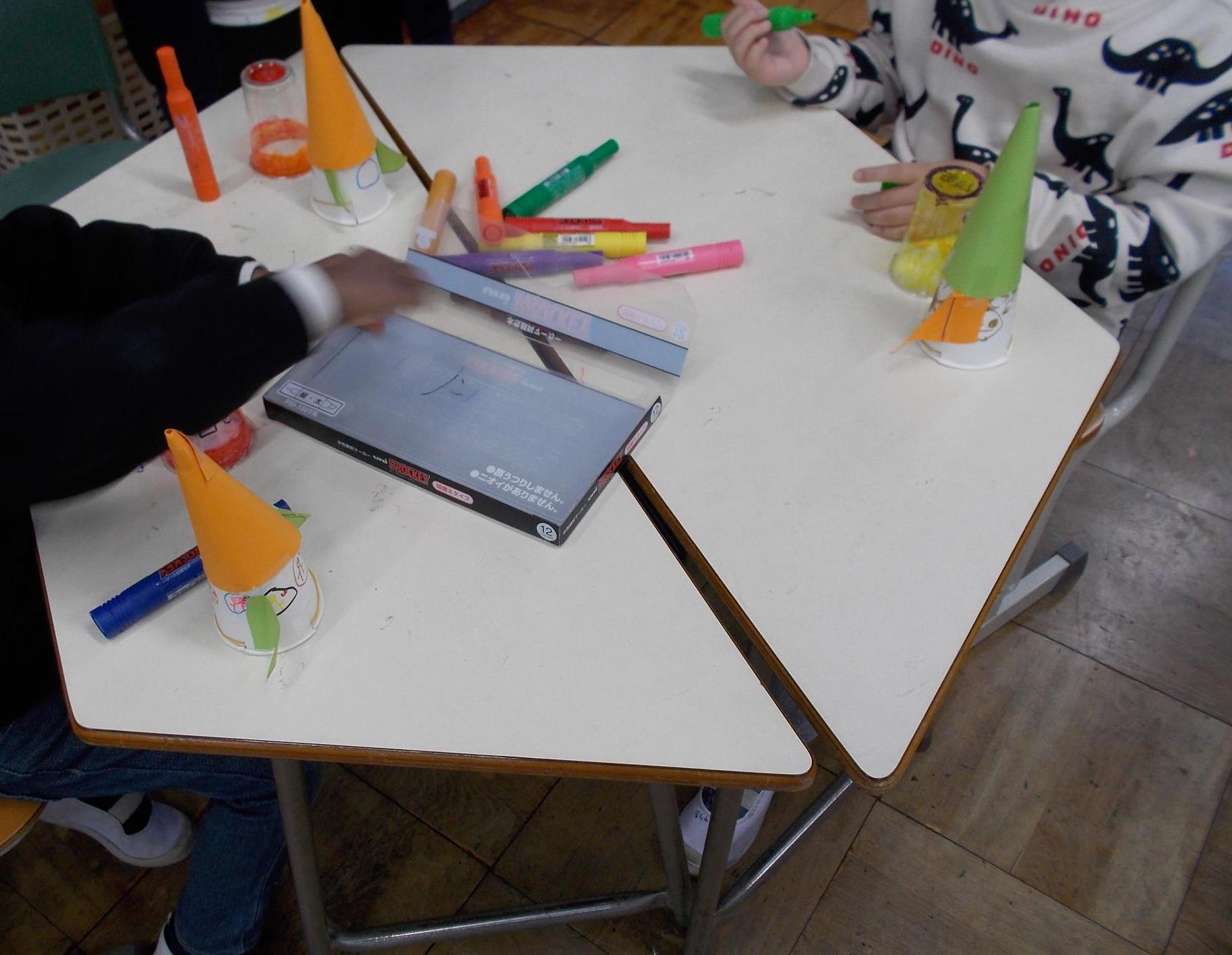 現在、生活科の授業では自分でおもちゃを作り、遊び方を工夫して楽しむ授業を行っています。おもちゃの作り方を動画で見て、個人で用意した飾りをつけ、オリジナルのおもちゃを作る姿はとても楽しそうでした。
