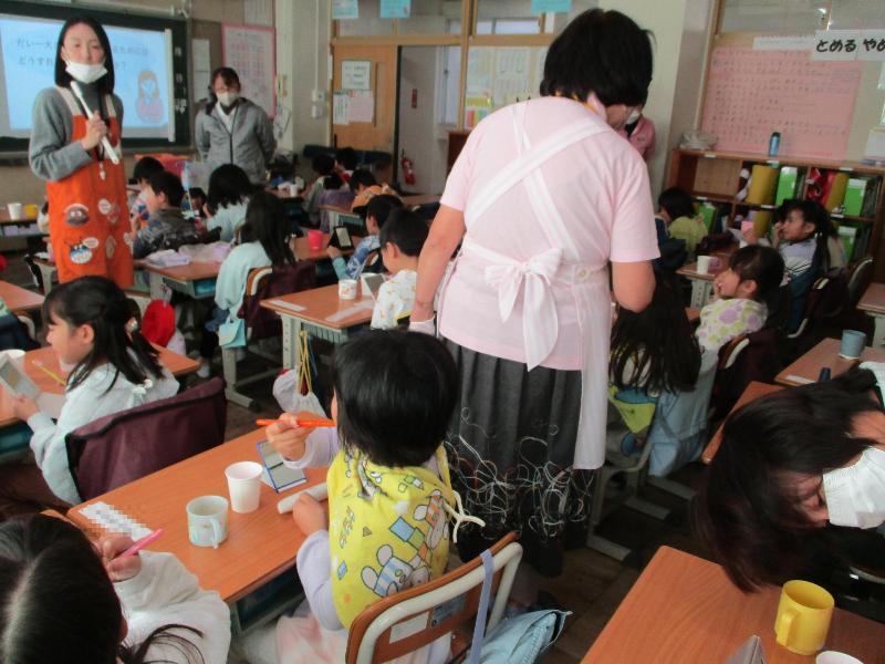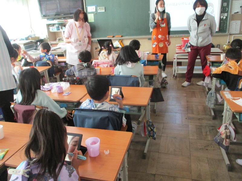 今日は、白井市の歯科衛生士さんが来てくださり、子供たちは、大切な六歳臼歯につちえ学びました。むし歯にならないように、上手なみがき方も教えていただきました。染め出しで赤くなってしまったところも、正しいみがき方をすると、きれいになりました。