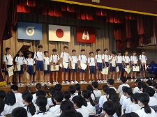 今日から帰りの会が15分延長され、合唱コンクールに向けての練習が本格化してきました。1年生は体育館で、合同での学年合唱練習です。1年生の学年合唱曲は「大切なもの」です。1ヶ月かけて、先輩達に負けない合唱に仕上がるよう頑張ります。