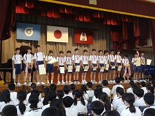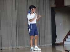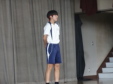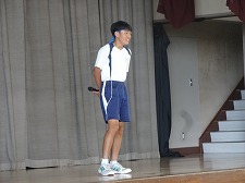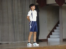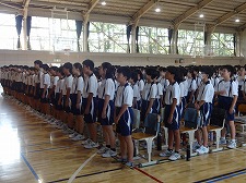 夏休みが終わり今日から前期後半が始まり、1校時は全校集会です。最初に7月から夏休み中にかけての表彰が行われ、たくさんの生徒が登壇しました。そのあと全校での校歌斉唱、校長先生の話です。やや室温が高かったですが、水分補給も入れ、しっかりとした態度で臨めました。