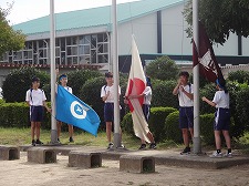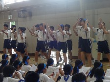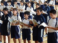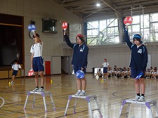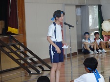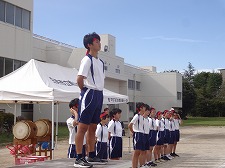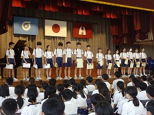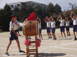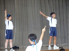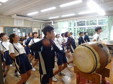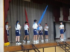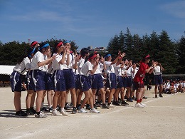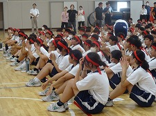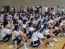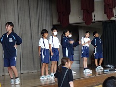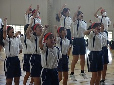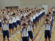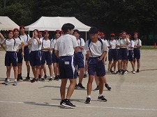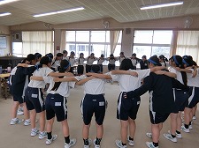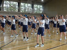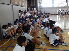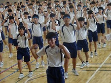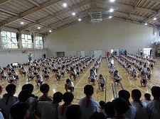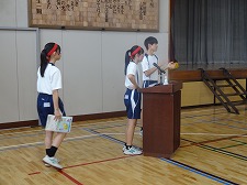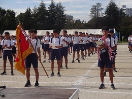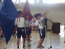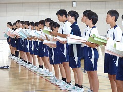5校時に体育館で結団式が行われました。体育祭実行委員が進行して、団旗の受け渡し、応援団長からの想いを込めた話、各色応援リーダーの紹介、色別対抗リレーの選手決め、そしてリーダーから応援の手本が示されました。応援リーダーの手本は夏休みの練習しただけあって気合いの入った素晴らしいものでした。明日から練習開始です。しっかりと睡眠、朝食を取って、水筒も忘れないようにしましょう。