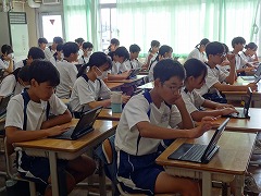 朝の時間に前期学校評価について、タブレットで回答しました。ご家庭にもお手紙を配付しましたので、ぜひご協力をお願いします。