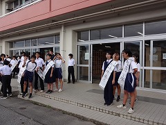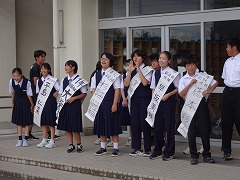 生徒会役員選挙の選挙運動が本日より開始となりました。今回は7つの役職に12人の立候補者が出ています。朝の登校時に、選挙管理委員が見守る中、立候補者とその応援責任者が元気よくあいさつをしています。