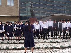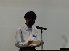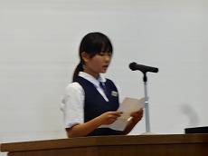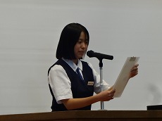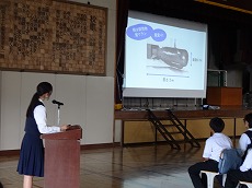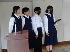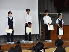表彰の後、夏休みに市の平和使節団の一員として広島を訪れた4名の生徒から、全校生徒への報告が行われました。原爆とはどのようなものか、落とされた広島はどうなったか、など自分たちで調べたことや、訪れてわかったことなどを交えて平和の大切さを訴えました。原稿からパワーポイントの資料作成まで、すべて自分たちで行った素晴らしい報告会でした。